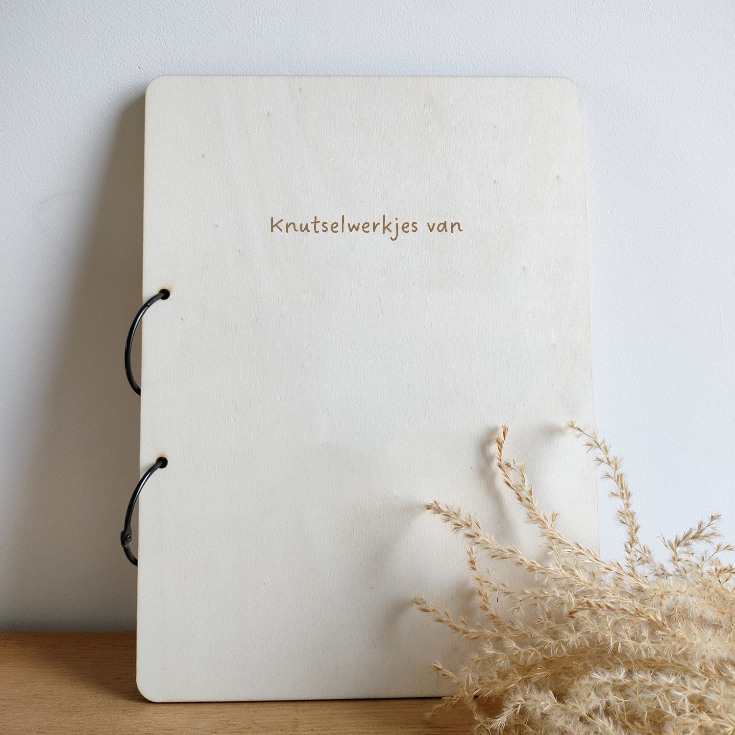 Bewaarmap met houten kaft en grote ringen, om de knutselwerkjes van je kids in te bewaren.