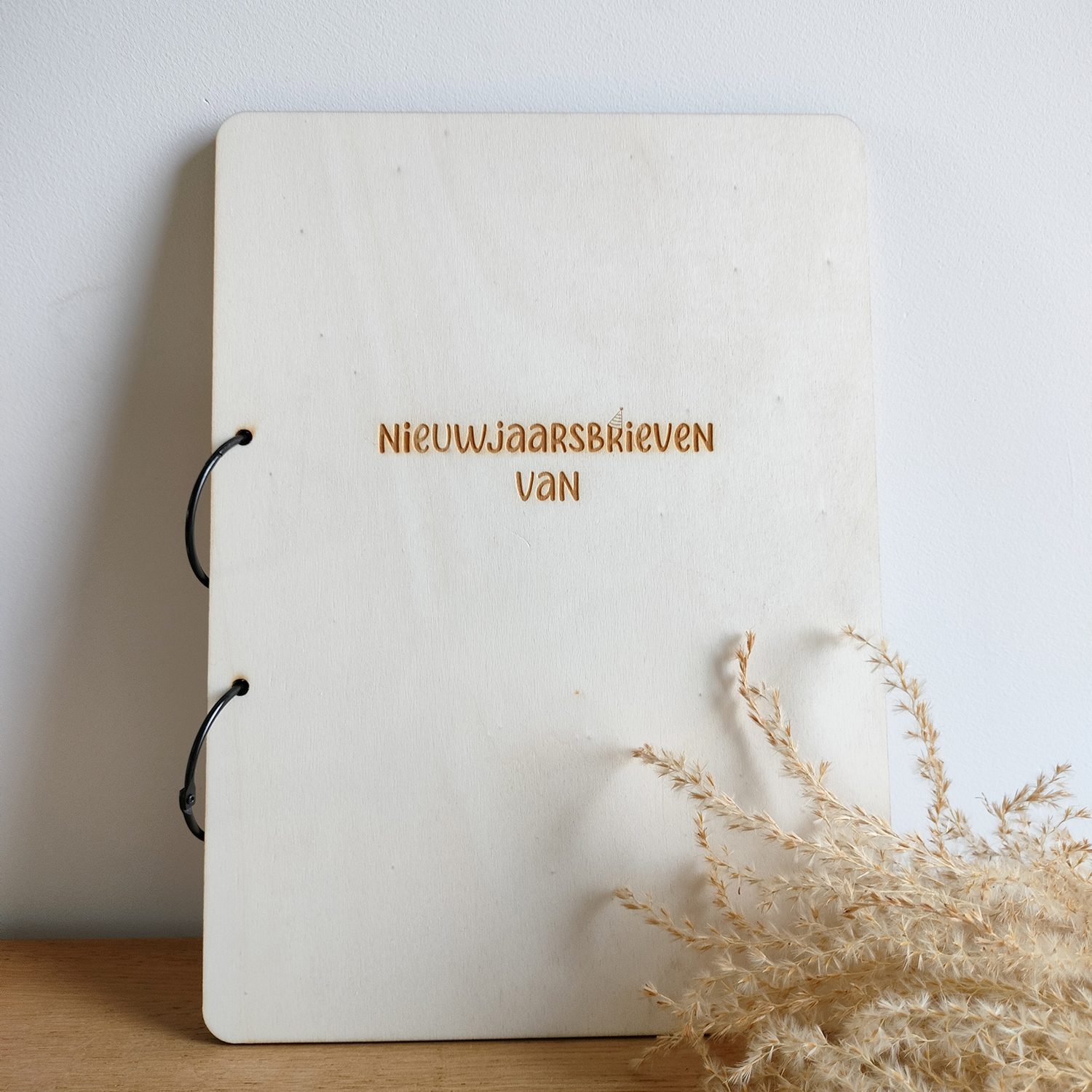 Bewaarmap met houten kaft en grote ringen, om de nieuwjaarsbrieven van je kinderen, kleinkinderen, mete- of petekindjes in te bewaren.