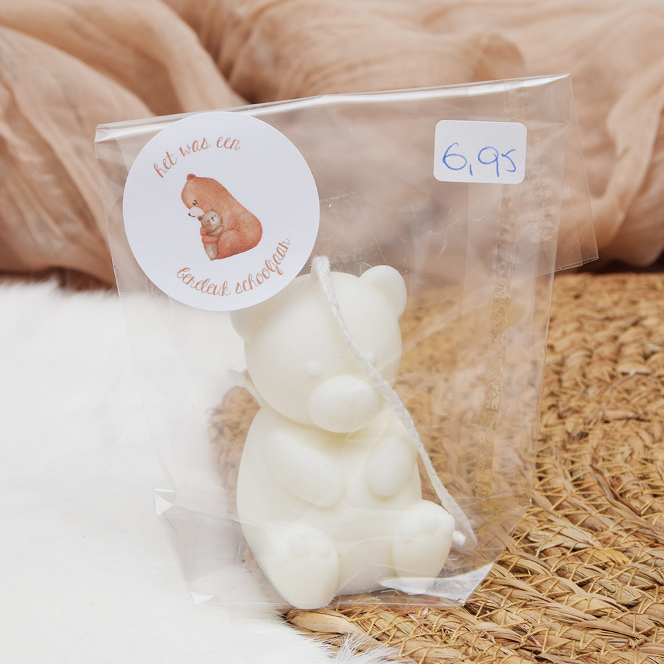 Een schattig kaarsje in de vorm van een beertje, afgewerkt met een label ‘het was een bereleuk schooljaar’.