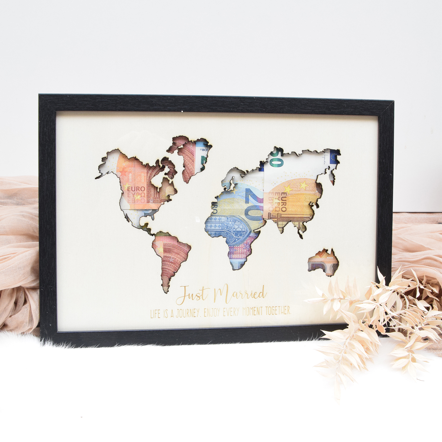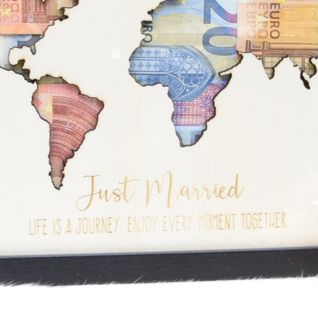 In de kader zit een houten plaat met het silhouette van een wereldkaart eruitgesneden en met gegraveerde tekst ‘just married. Life is a journey. Enjoy every moment together.’