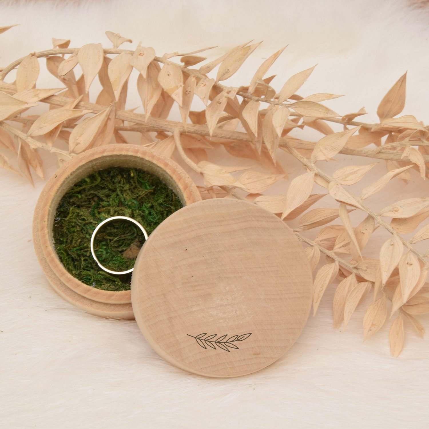 Een prachtig houten ringendoosje, gevuld met kunstmos aan de binnenkant en gravure op het houten deksel.
