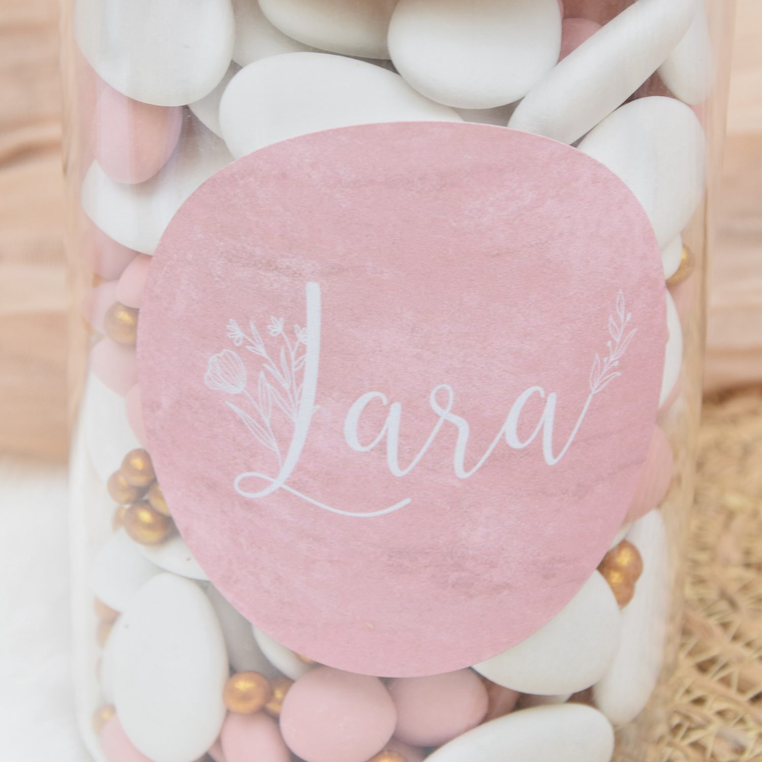 Een ronde sticker van 8cm is ideaal voor het afwerken van grotere uitdeelpotten om te trakteren voor je collega’s bijvoorbeeld.